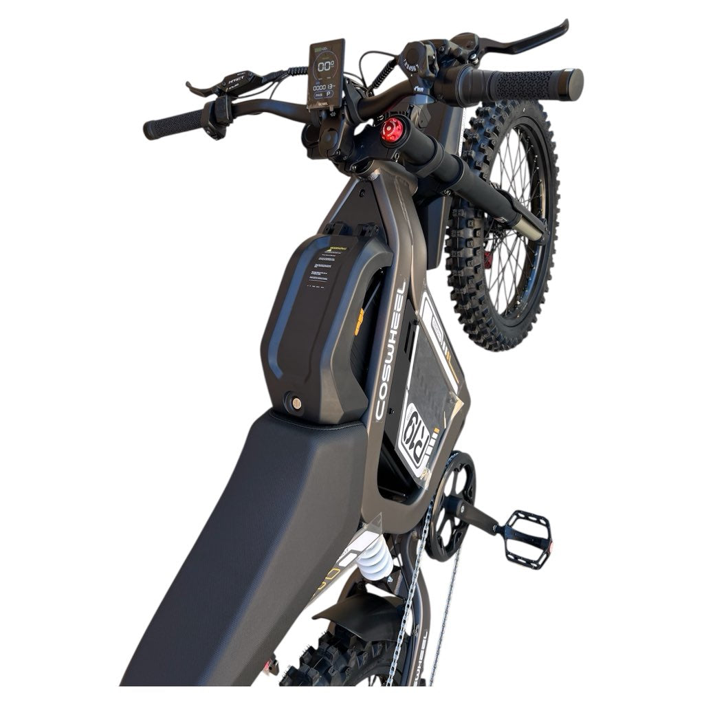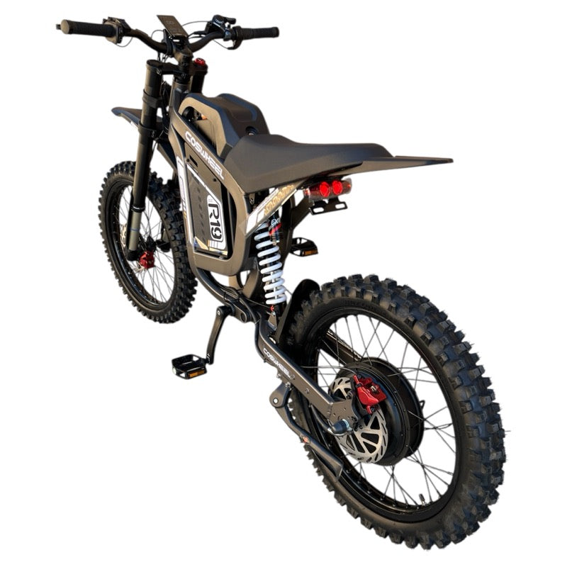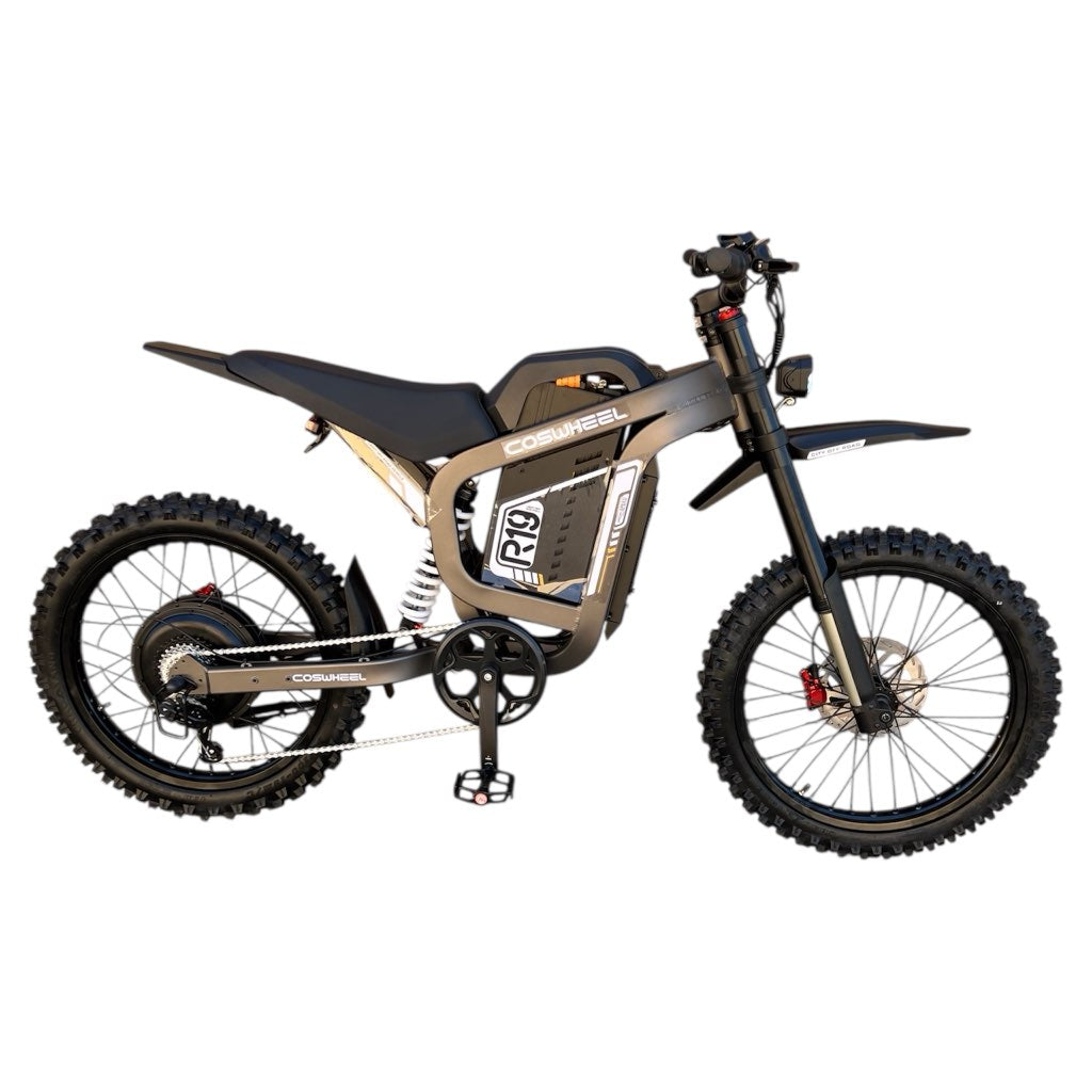 The Cosweel R19 Full Suspension Electric Dirt Bike features a 72V peak 6000W (rated 3000W) brushless rear hub motor, delivering 120Nm of torque. It reaches a top speed of 50 MPH (80 Km/h) and is equipped with a 7-speed transmission system for optimal performance.
