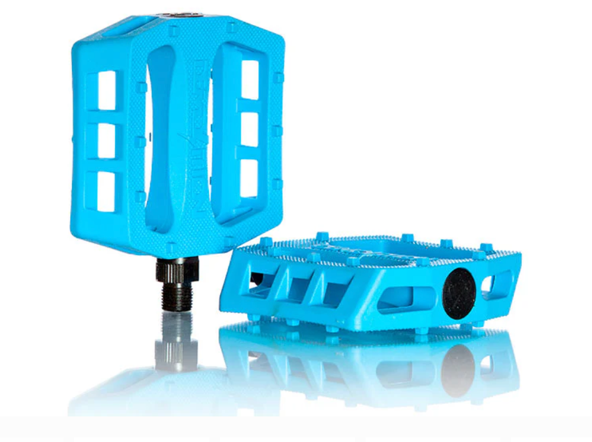 Nylon plastic body with 10 square molded pins for added grip. Concaved horizontally to grip the sole of your shoe better and for added comfort. Also features a solid heat treated CRMO spindle. Available with unsealed bearings only.
